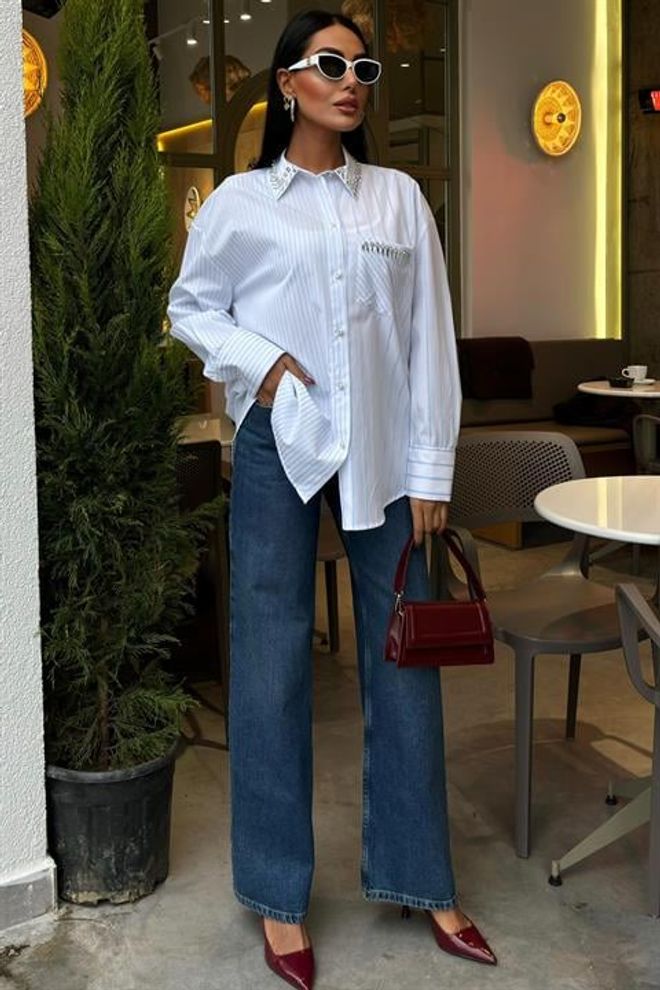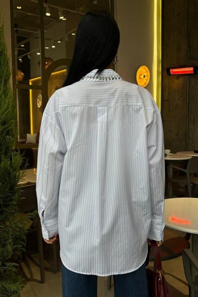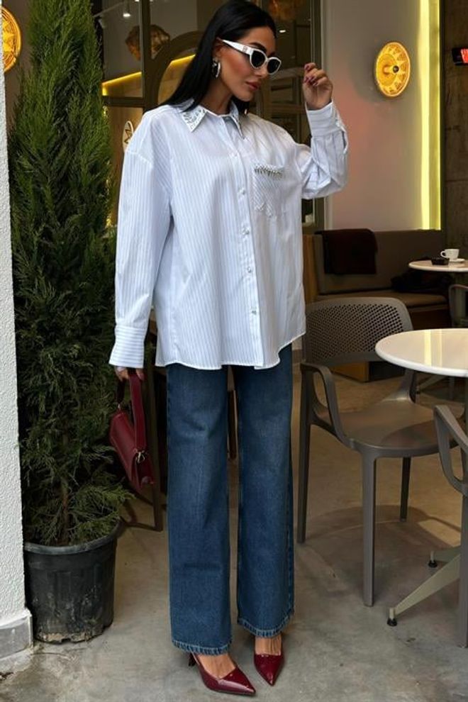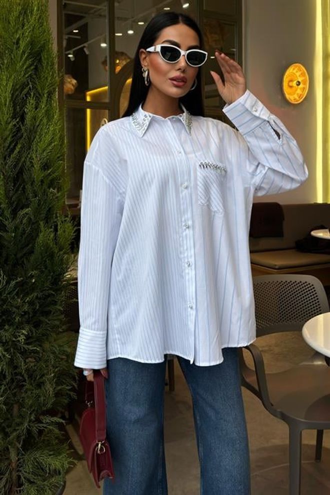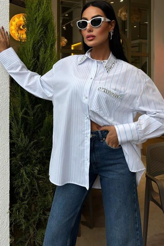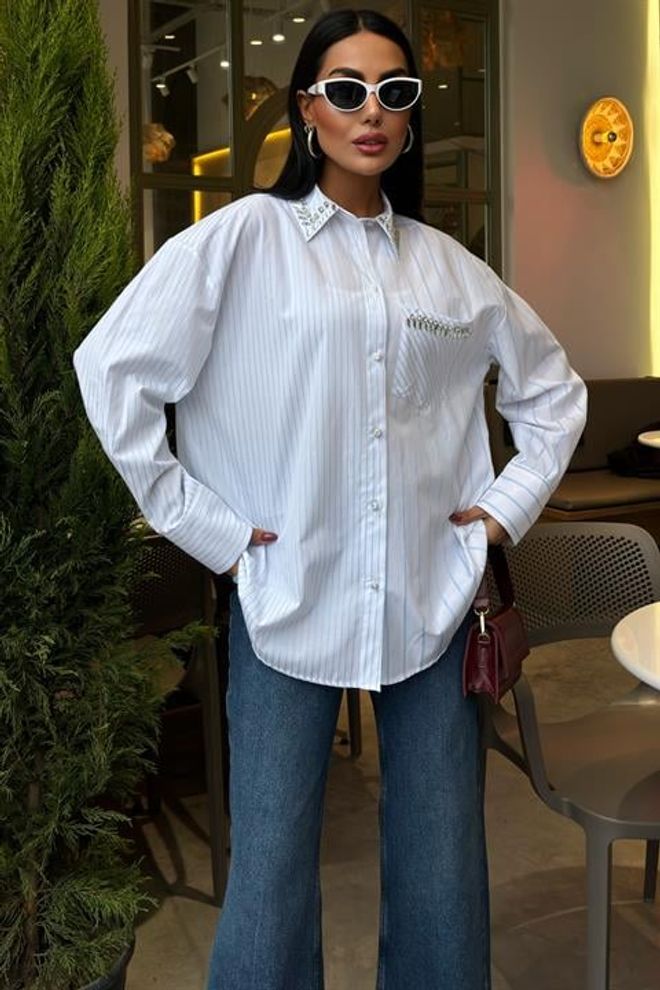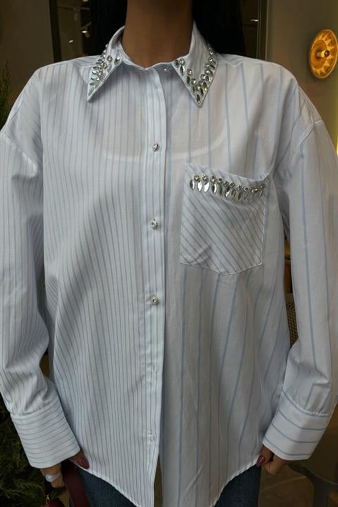 Esta camisola às riscas apresenta uma elegante gola e um bolso adornado com delicadas pedras. Confeccionada com materiais de alta qualidade, proporciona conforto e estilo em qualquer ocasião. Perfeita para adicionar um toque de sofisticação ao seu guarda-roupa.