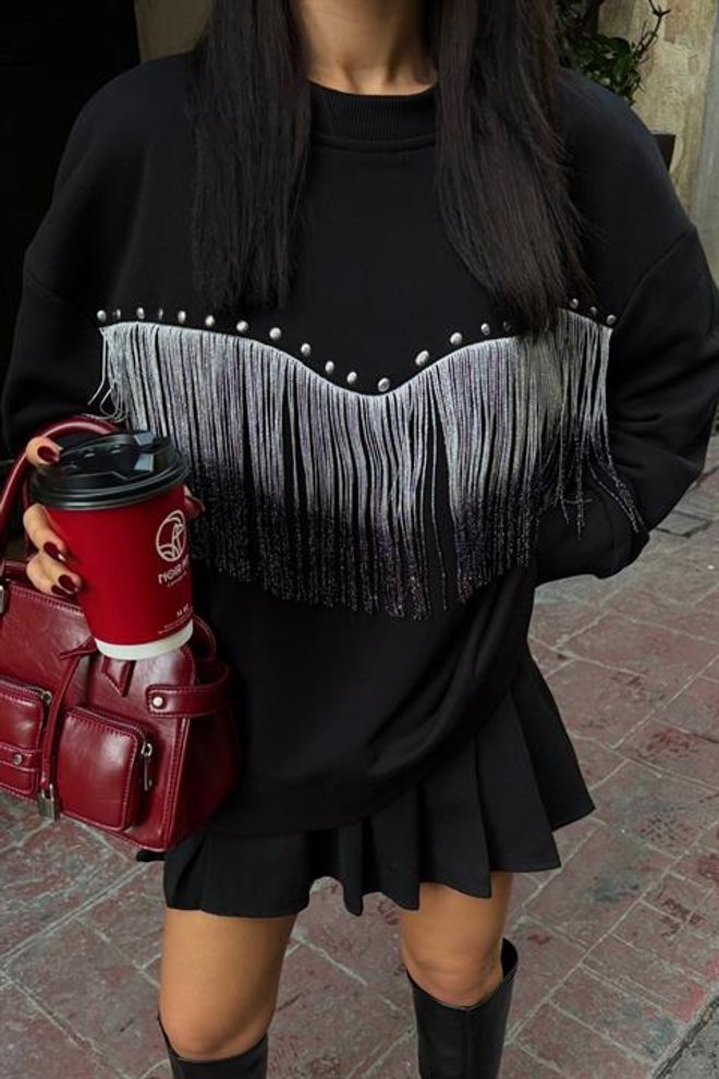 Esta camisola preta com pormenores em borla é perfeita para qualquer ocasião. Com detalhes elegantes em borla, ela vai te manter quente e estilosa durante todo o dia. Feita com tecido de alta qualidade, ela é durável e confortável. Adicione um toque de sofisticação ao seu guarda-roupa com esta camisola única.