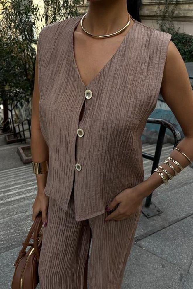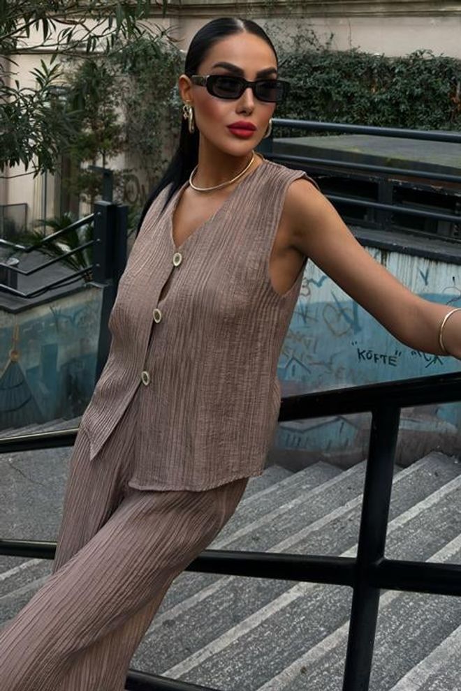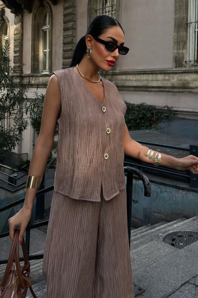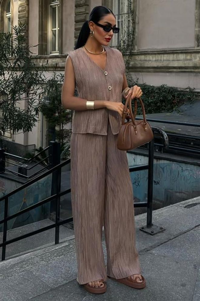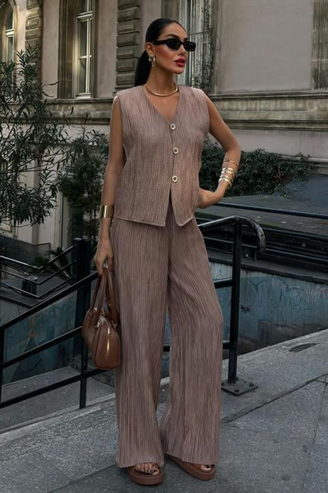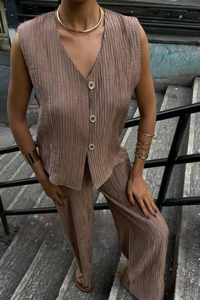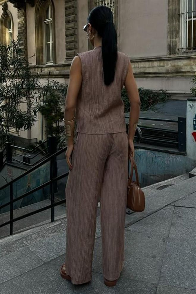 Conjunto de calças em tecido plissado na elegante cor Pedra. Desfrute do conforto e estilo dessa peça versátil, perfeita para qualquer ocasião. O tecido plissado proporciona um visual moderno e sofisticado, enquanto a cor neutra permite fácil combinação com diversas blusas e acessórios.