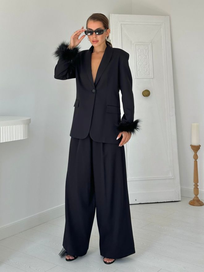 Este conjunto de casaco e calças com mangas de penas é uma escolha elegante e funcional para o seu guarda-roupas. O tecido preto de alta qualidade garante durabilidade e conforto, enquanto as mangas de penas adicionam um toque de estilo único. Fique quente e estiloso com este conjunto em qualquer ocasião.