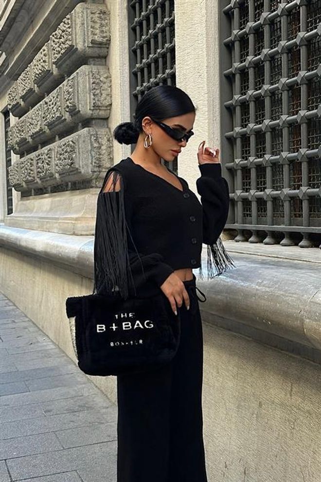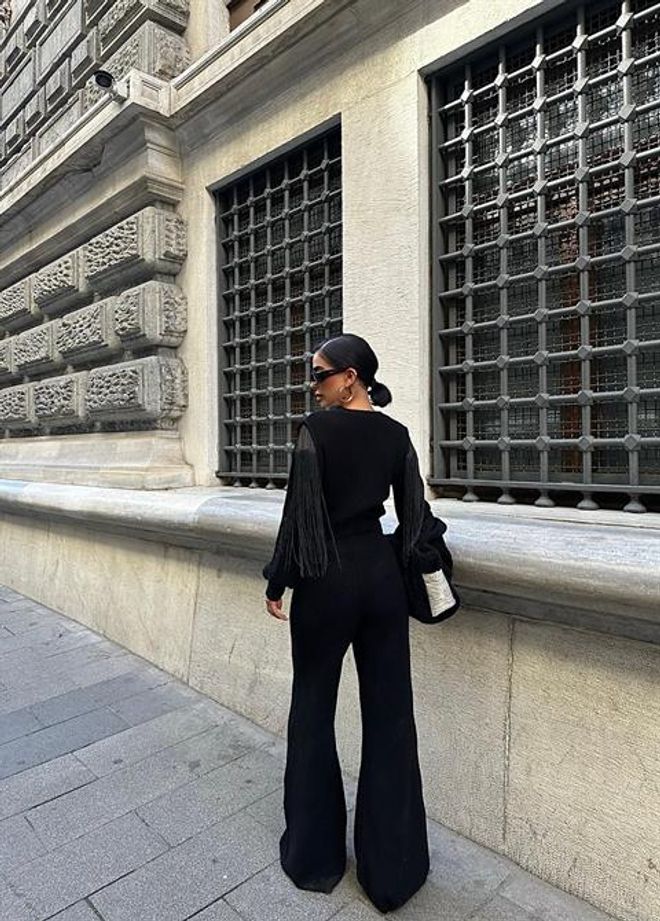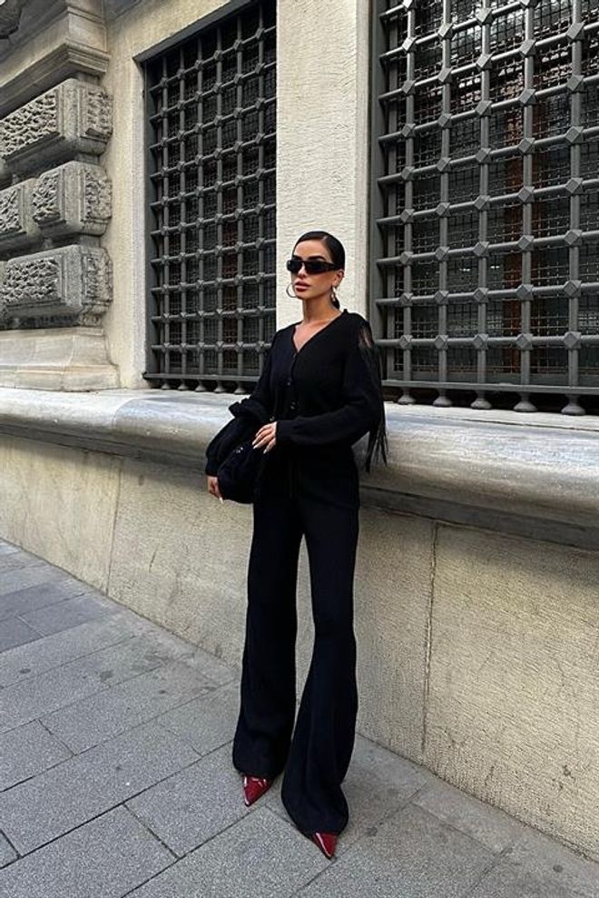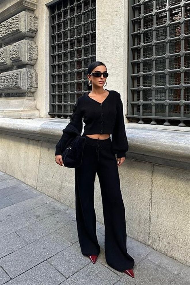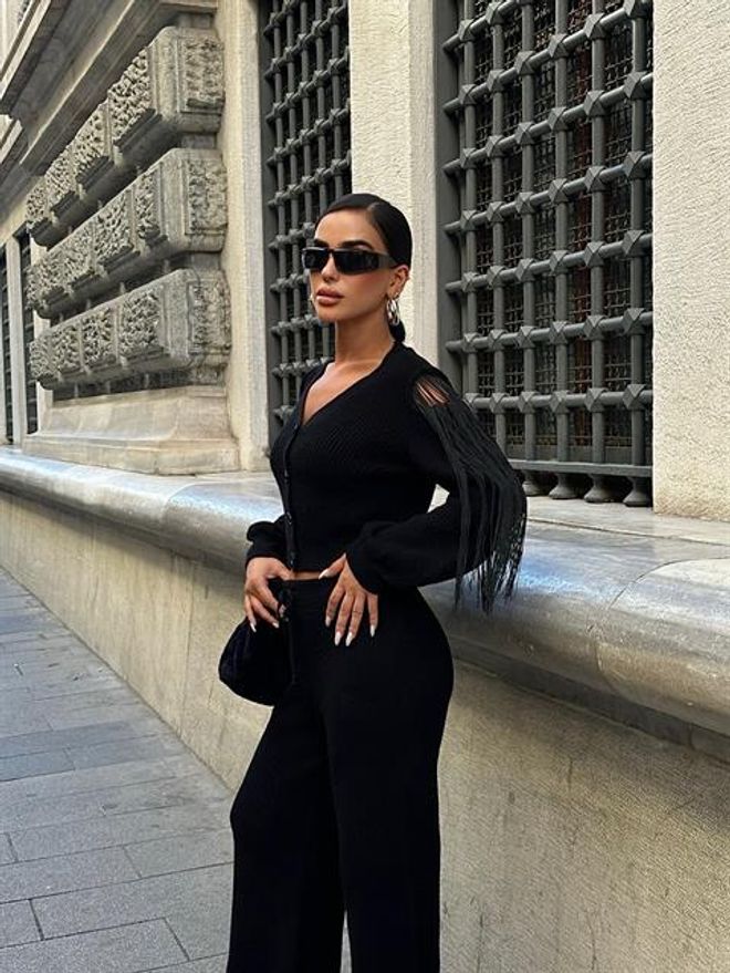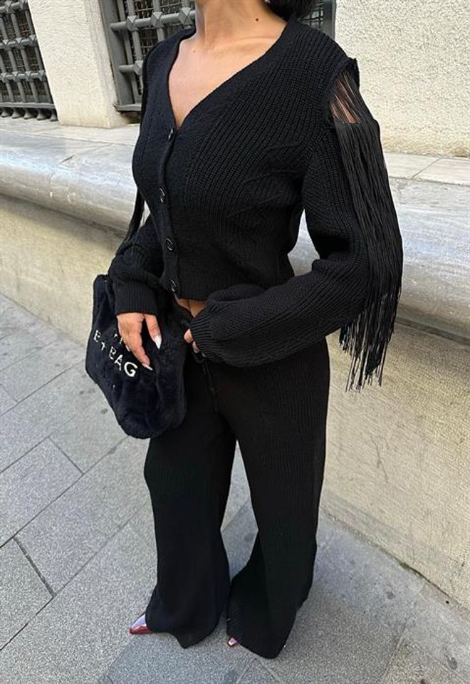 Este conjunto de malha inclui uma calça e um casaco com pormenores de borlas. Feito com materiais de qualidade, garante conforto e estilo em um só produto. Perfeito para completar o look com elegância e sofisticação.