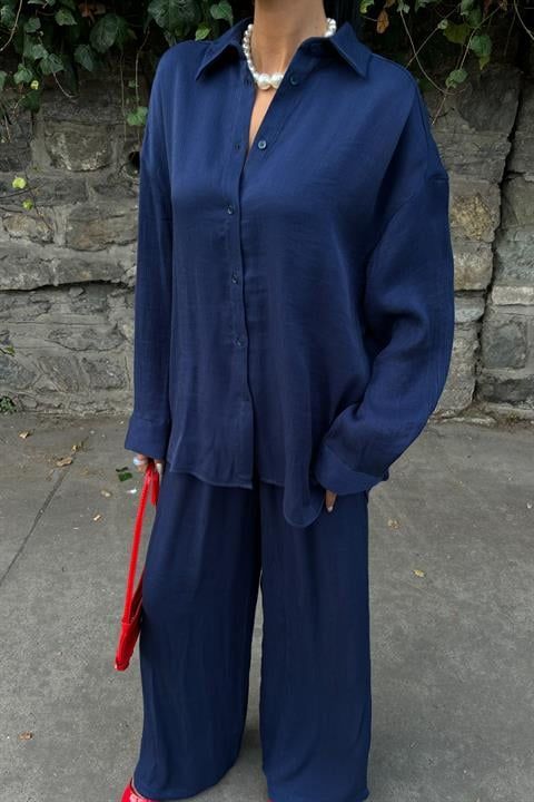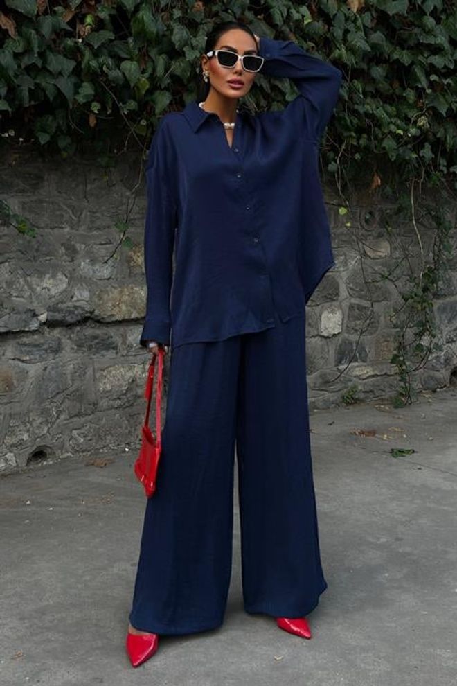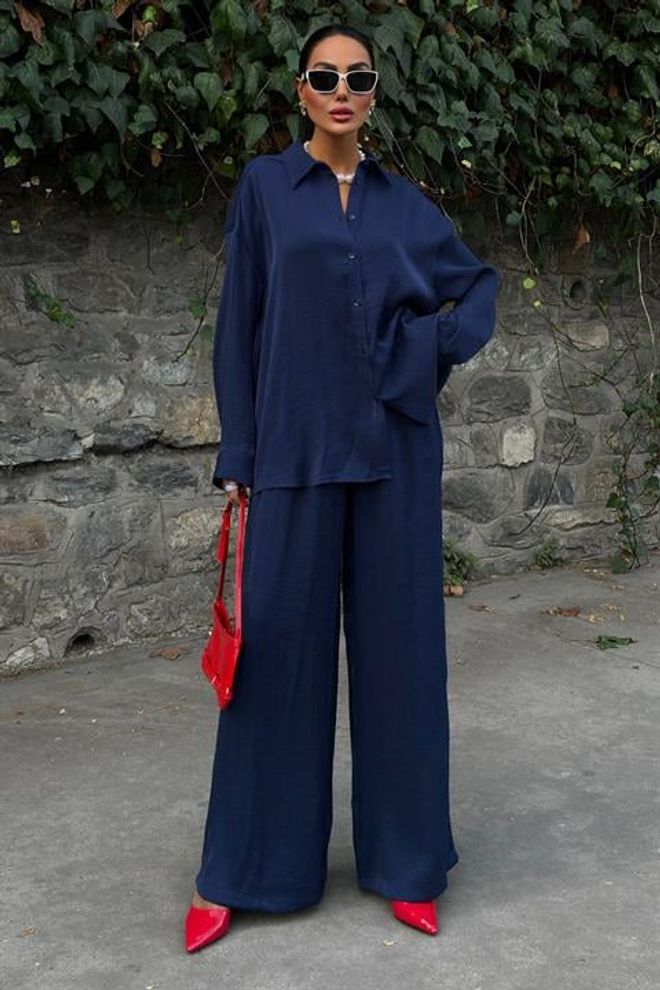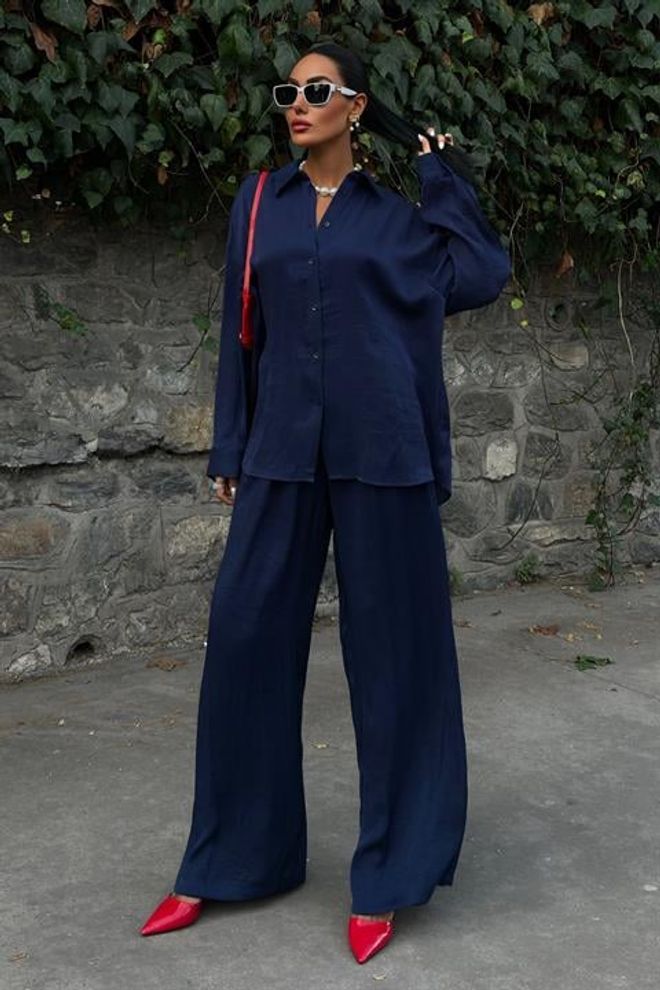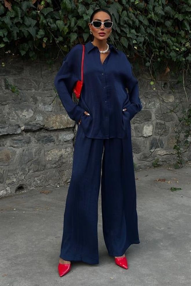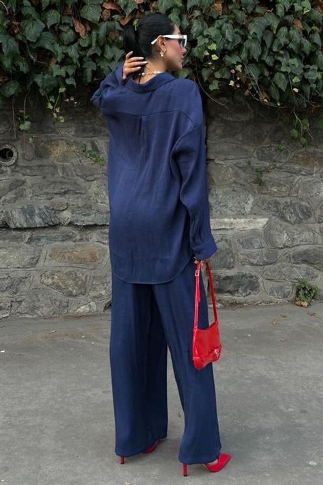 Fato casual de calças em tecido brilhante