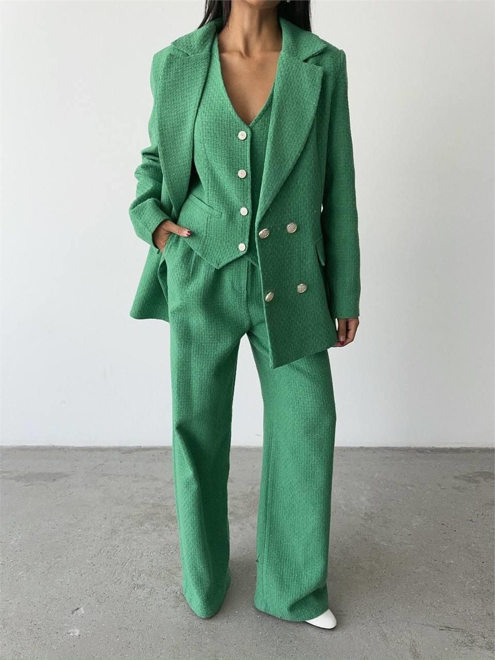 Este fato de 3 peças é feito de tecido de tweed, proporcionando um visual elegante e sofisticado. Composto por paletó, colete e calça, é ideal para ocasiões especiais ou ambientes de trabalho formais. O tecido de tweed é conhecido por sua durabilidade e resistência, garantindo um produto de alta qualidade.