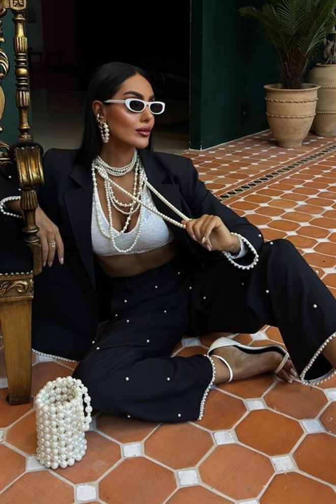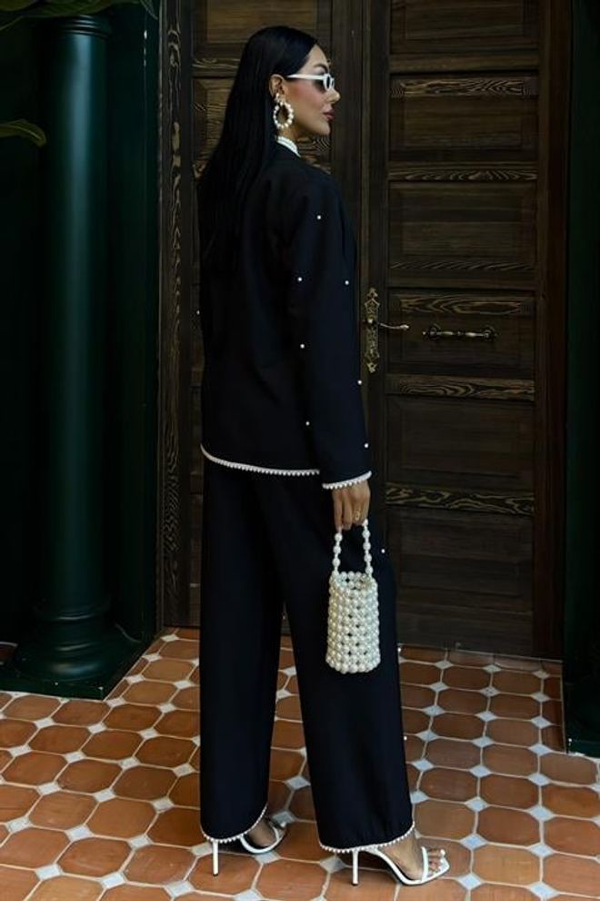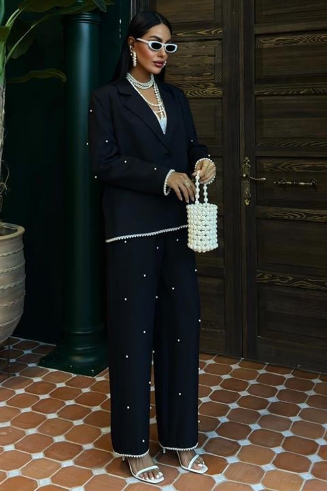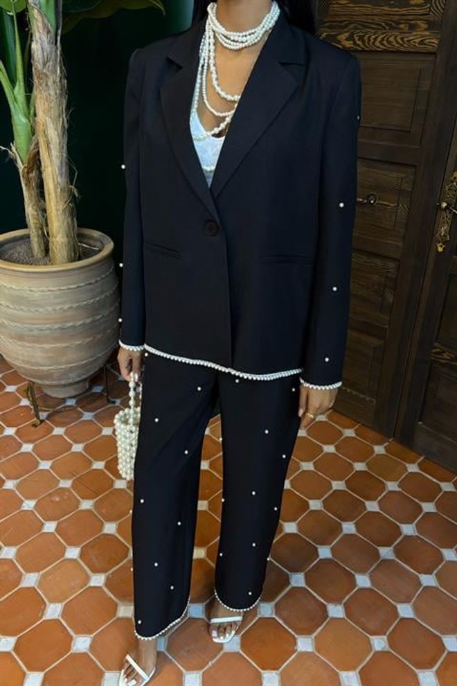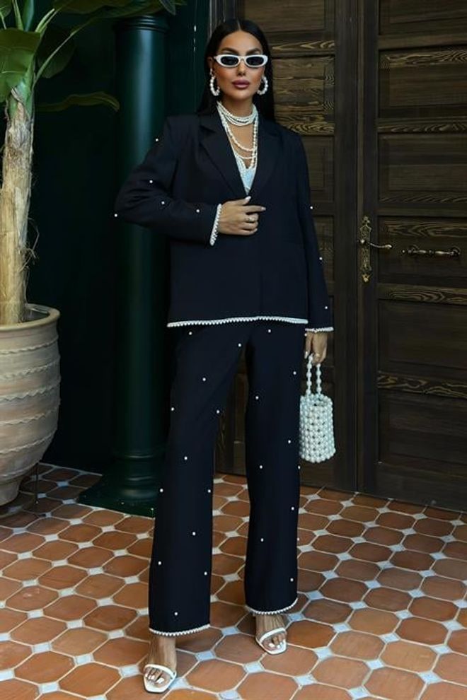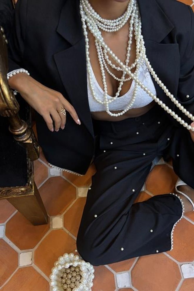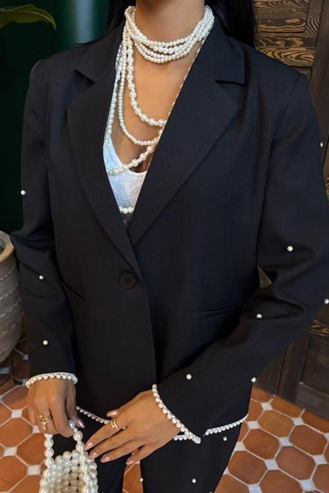 Este fato de linho preto é a escolha perfeita para se destacar. Com detalhes em pérolas, este fato não só oferece um toque sofisticado ao seu visual, mas também é feito com um material leve e respirável para garantir conforto durante todo o dia. Com certeza é um ótimo investimento para seu guarda-roupa.
