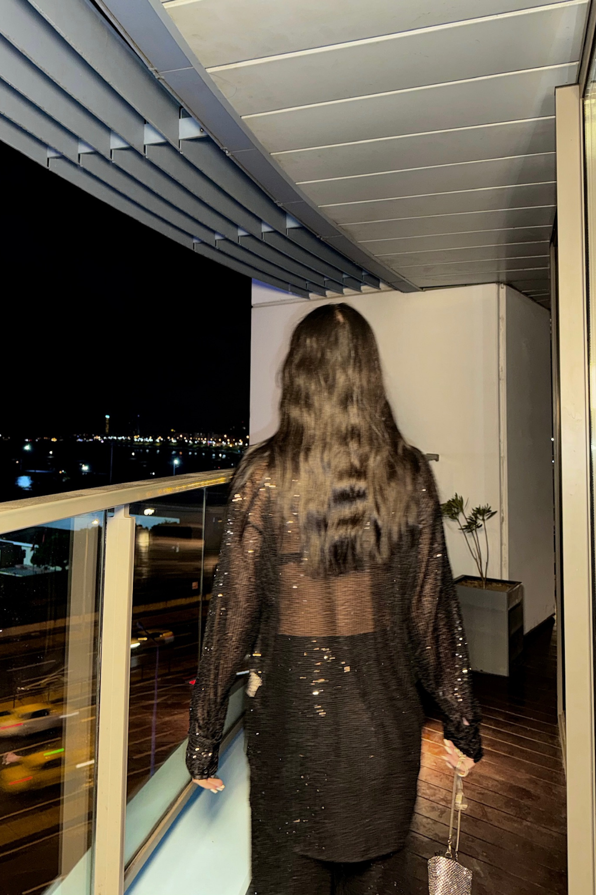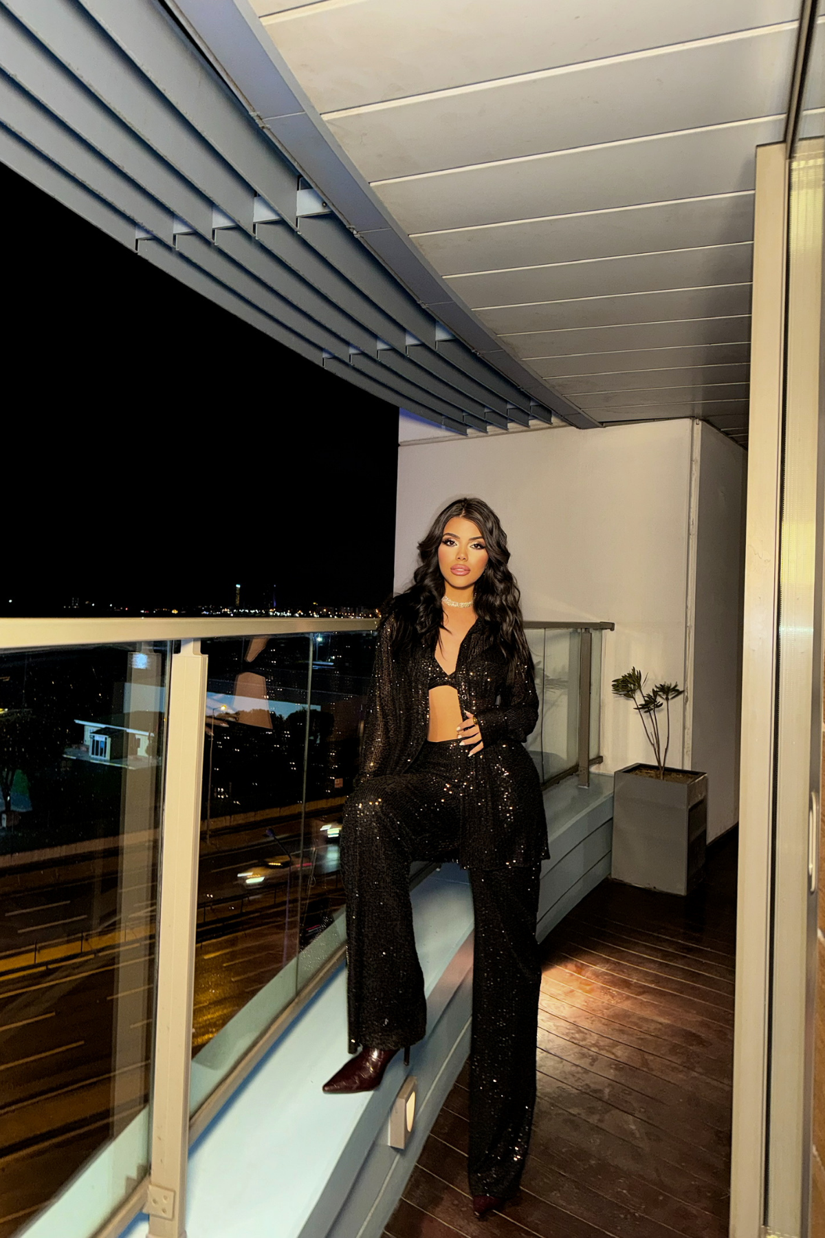 Este Fato de Três Peças Preto com lantejoulas é o must-have para qualquer ocasião formal. Com seu design elegante e sofisticado e o toque brilhante das lantejoulas, você se destacará em qualquer evento. Feito com materiais de alta qualidade, este fato garante conforto e estilo ao mesmo tempo.