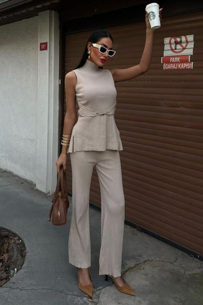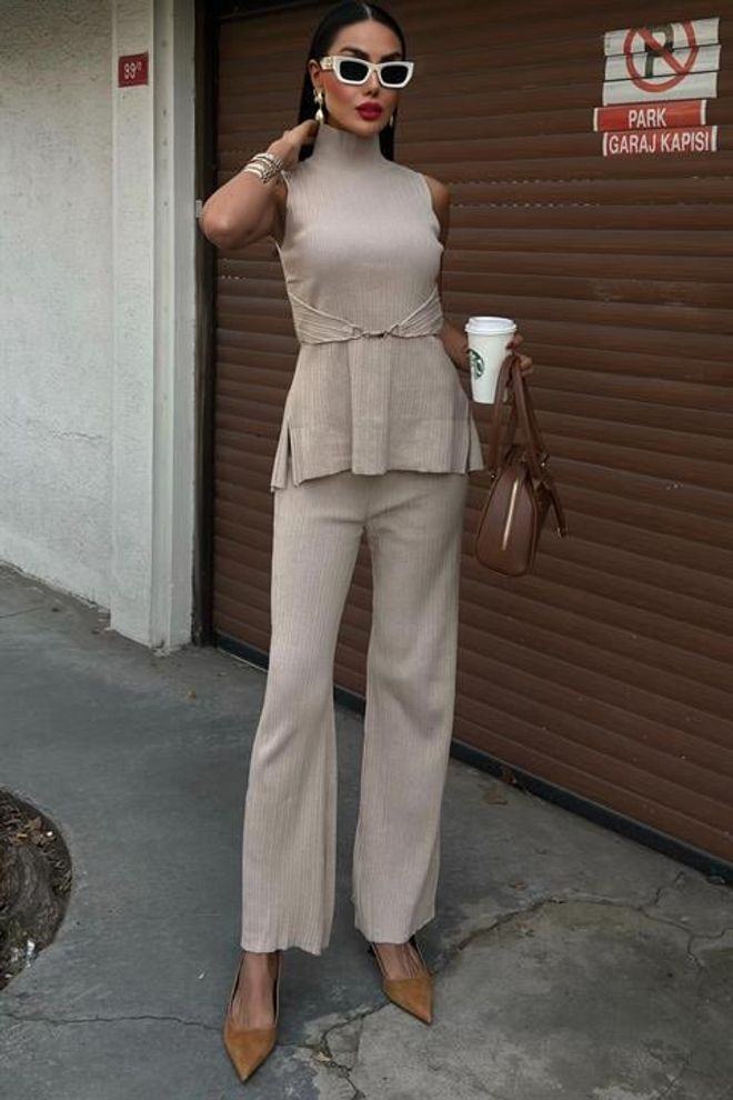 Fato de calças com gola alta