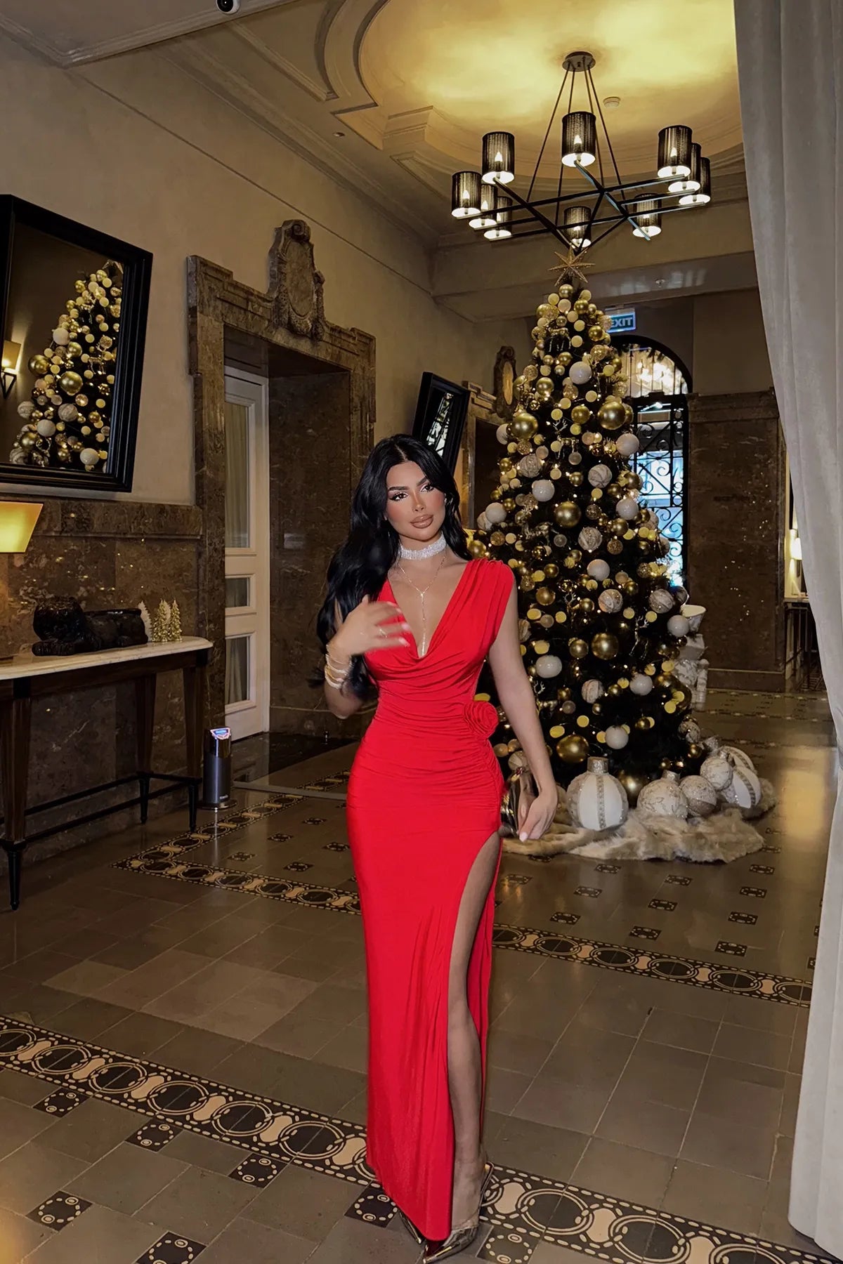 Este vestido elegante apresenta um belo pormenor de rosa vermelha, trazendo um toque de charme e delicadeza ao seu look. Ideal para ocasiões especiais, o vestido é confeccionado com tecido de alta qualidade e possui um caimento perfeito, garantindo conforto e estilo. Adicione um toque de romantismo ao seu guarda-roupa com este maravilhoso vestido.